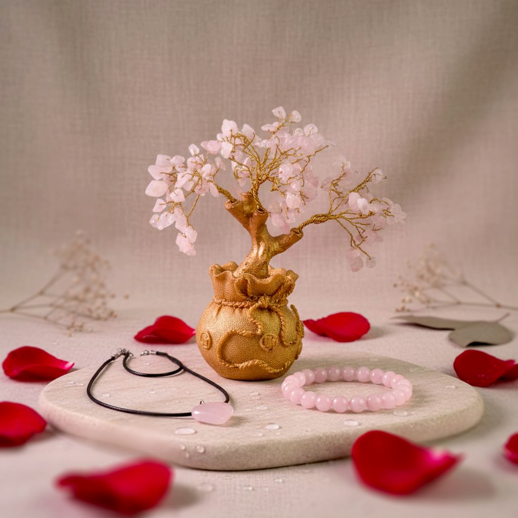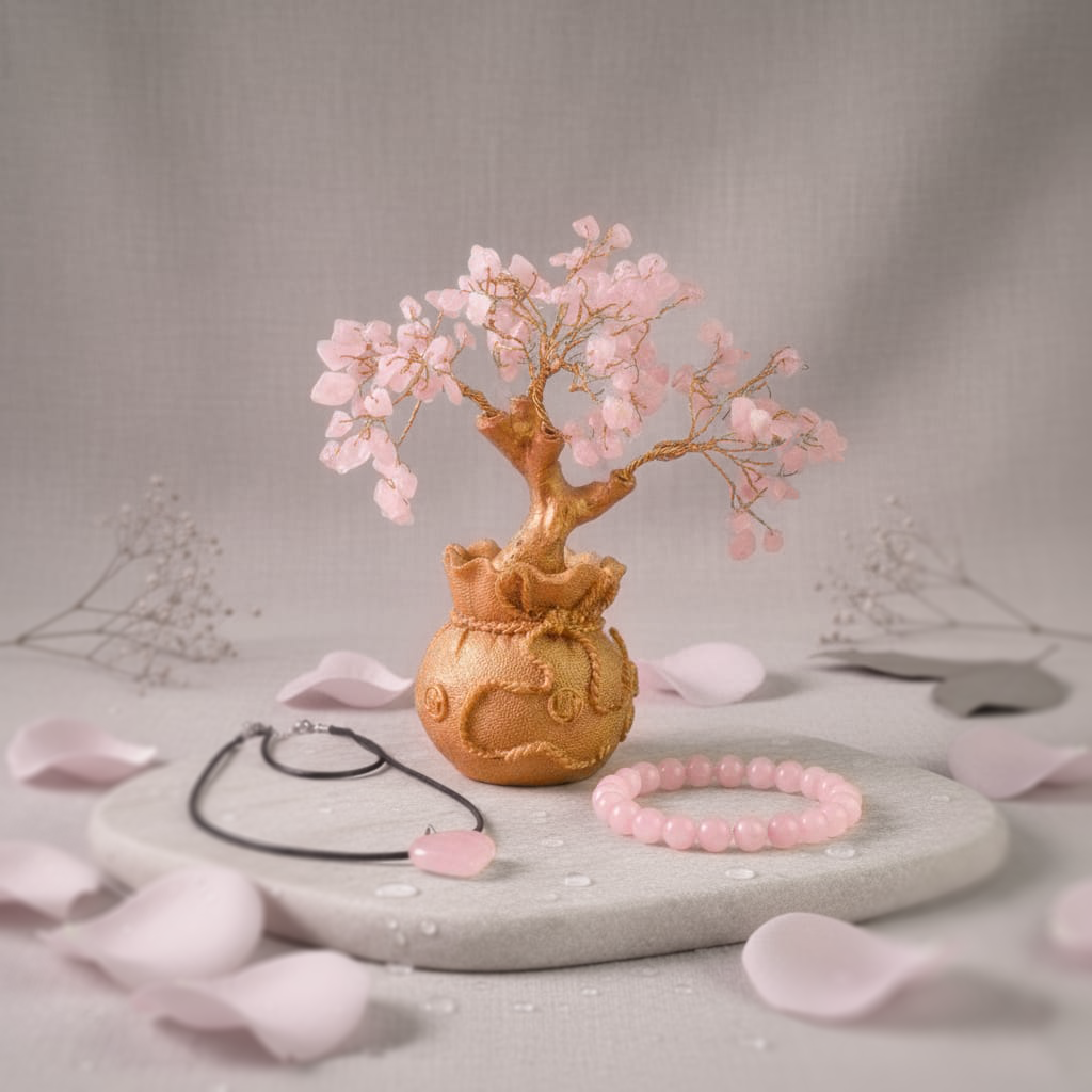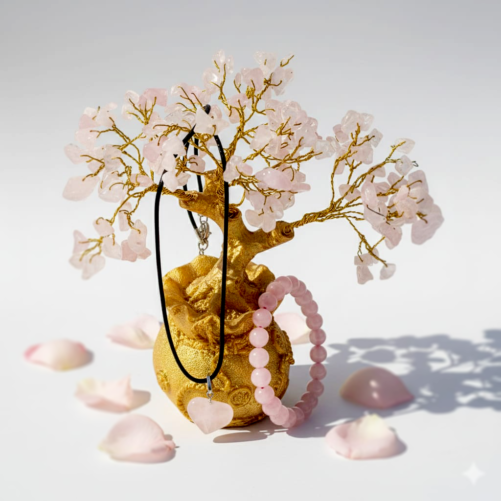 Rose Quartz Tree + Premium Rose Quartz Bracelet + Heart-Shaped Rose Quartz Pendant
